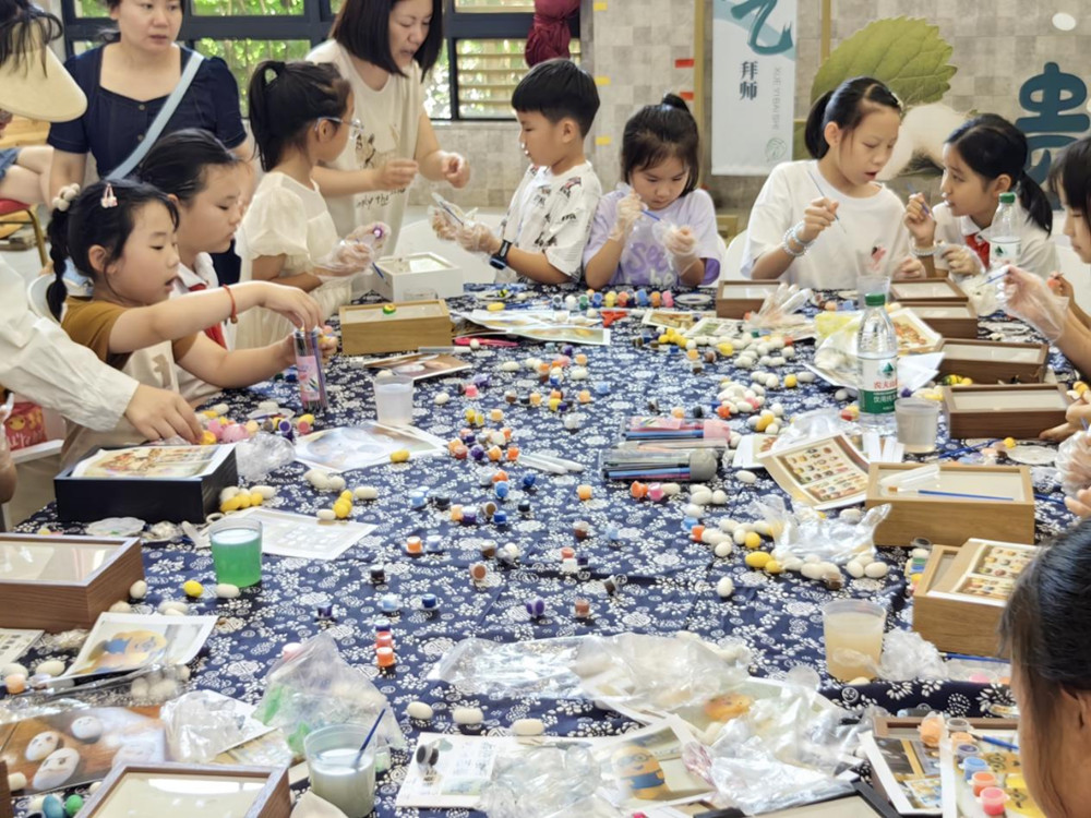 体验完清水丝绵的制作,孩子们又迎来了充满创意的蚕茧画环节。工作人员早已备好洁白的蚕茧、五彩的颜料和细尖的画笔。刚亲手触摸过蚕丝温润质感的孩子们,此刻更是兴致勃勃,一个个普通的蚕茧在画笔挥舞间,变成了承载着童真与想象的艺术品。