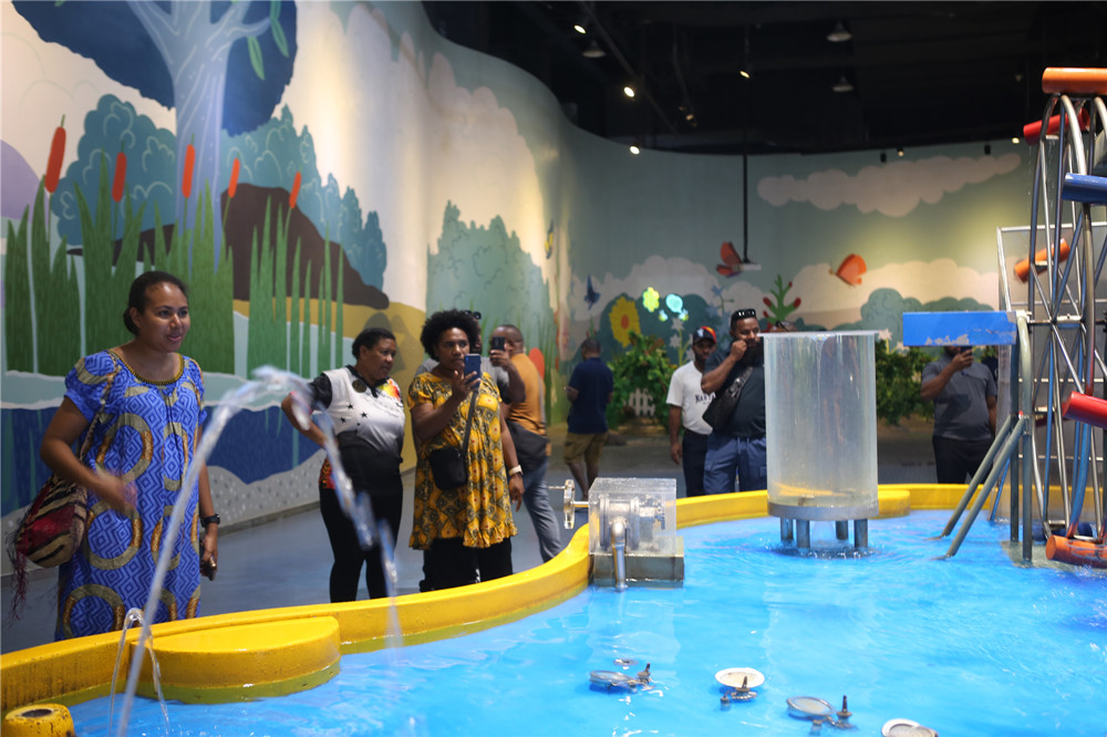 作为一个太平洋岛国,水资源管理与利用是巴布亚新几内亚代表团关注的焦点。在科技馆内,“提水奇趣”展项以其互动性和科学性吸引了众人的目光。代表团成员们饶有兴致地操作装置,亲身体验不同提水方式的原理和效率,感受科技如何让水资源利用焕发新生,激发创新思维。对于同样依赖海洋资源的他们,“海洋潮流能发电”展项更是引起了强烈共鸣。代表团成员详细询问了技术细节、应用前景以及对海洋生态环境的影响,对中国开发利用海洋清洁能源的前沿探索表示高度赞赏。