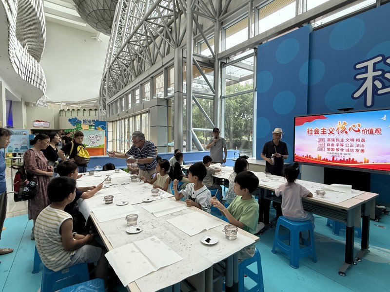 7月26日,中国杭州低碳科技馆联合杭州市民间文艺家协会、钱塘书画社,在科技馆一楼科普活动角共同举办了一场别开生面的书法和绘画课程。
