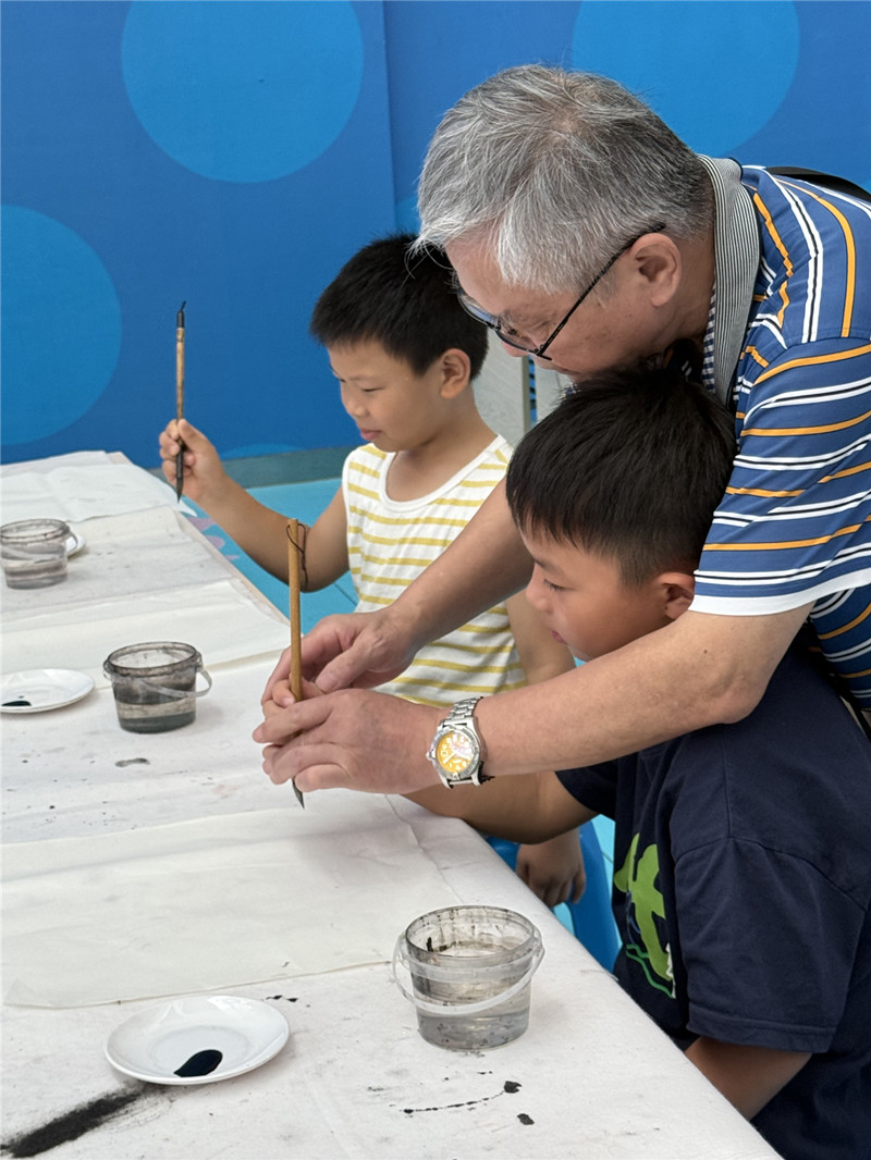 来自杭州市民间文艺家协会和钱塘书画社的老师们早早来到活动现场,为孩子们准备了丰富的绘画材料和书法用具。课程中,老师们通过生动有趣的讲解,向孩子们介绍了中国传统书画的基本技法和笔墨纸砚的使用方法,并深入浅出地讲解了书法结构之美和国画写意之韵。