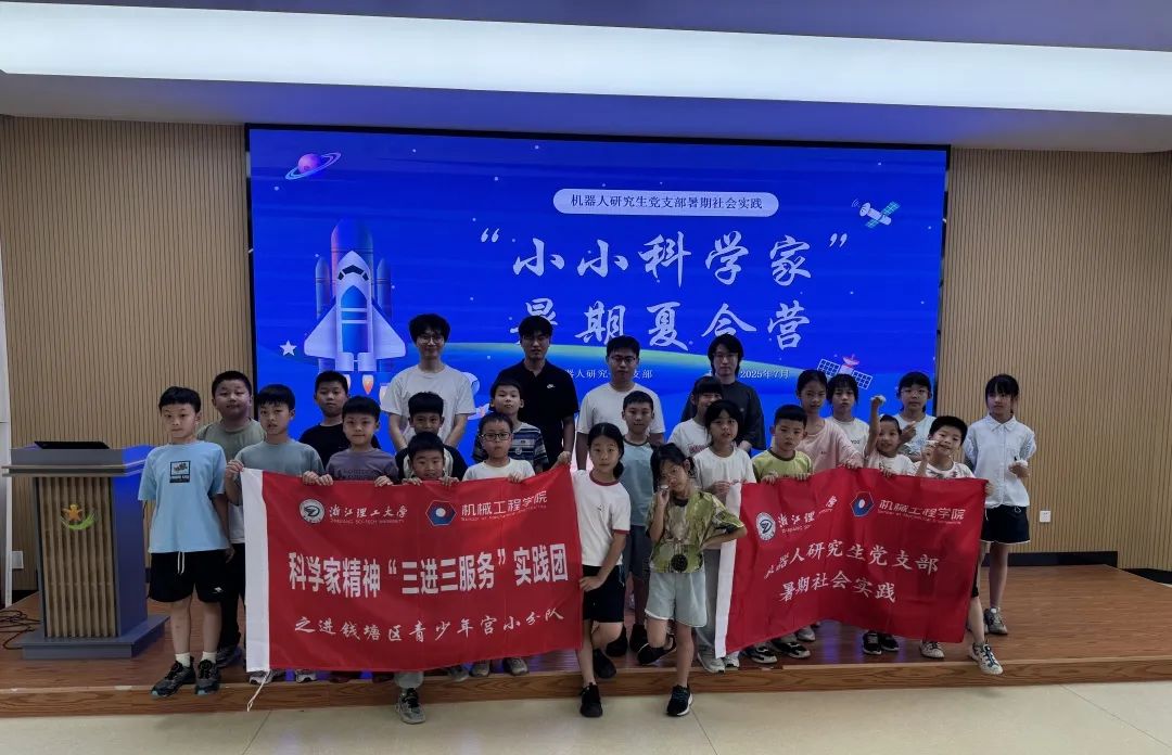 7月25日,浙江理工大学机器人研究生党支部在钱塘区青少年宫为孩子们带来了一场妙趣横生的“小小科学家”暑期夏令营活动。本次活动分为“科学家故事”“3d打印科普”“机器人探索”“科学游戏”四大主题模块,为二十余名中小学生打造了沉浸式科技体验。