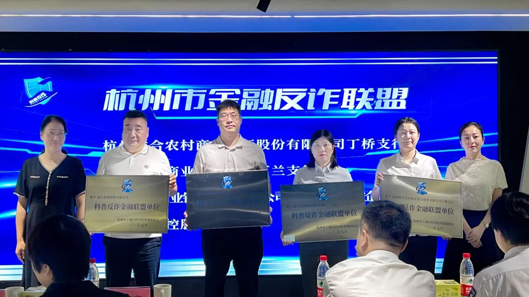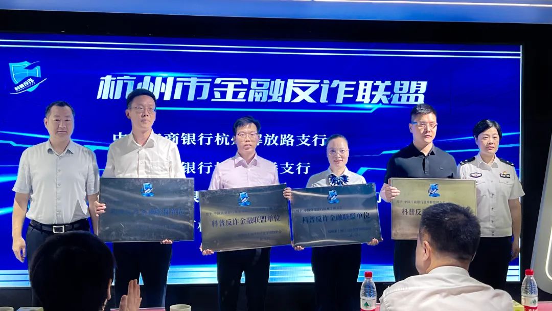 会上还成立了杭州市科普反诈金融联盟单位,杭州工商银行解放路支行等8家金融机构携手肩负起金融反诈的共同责任。