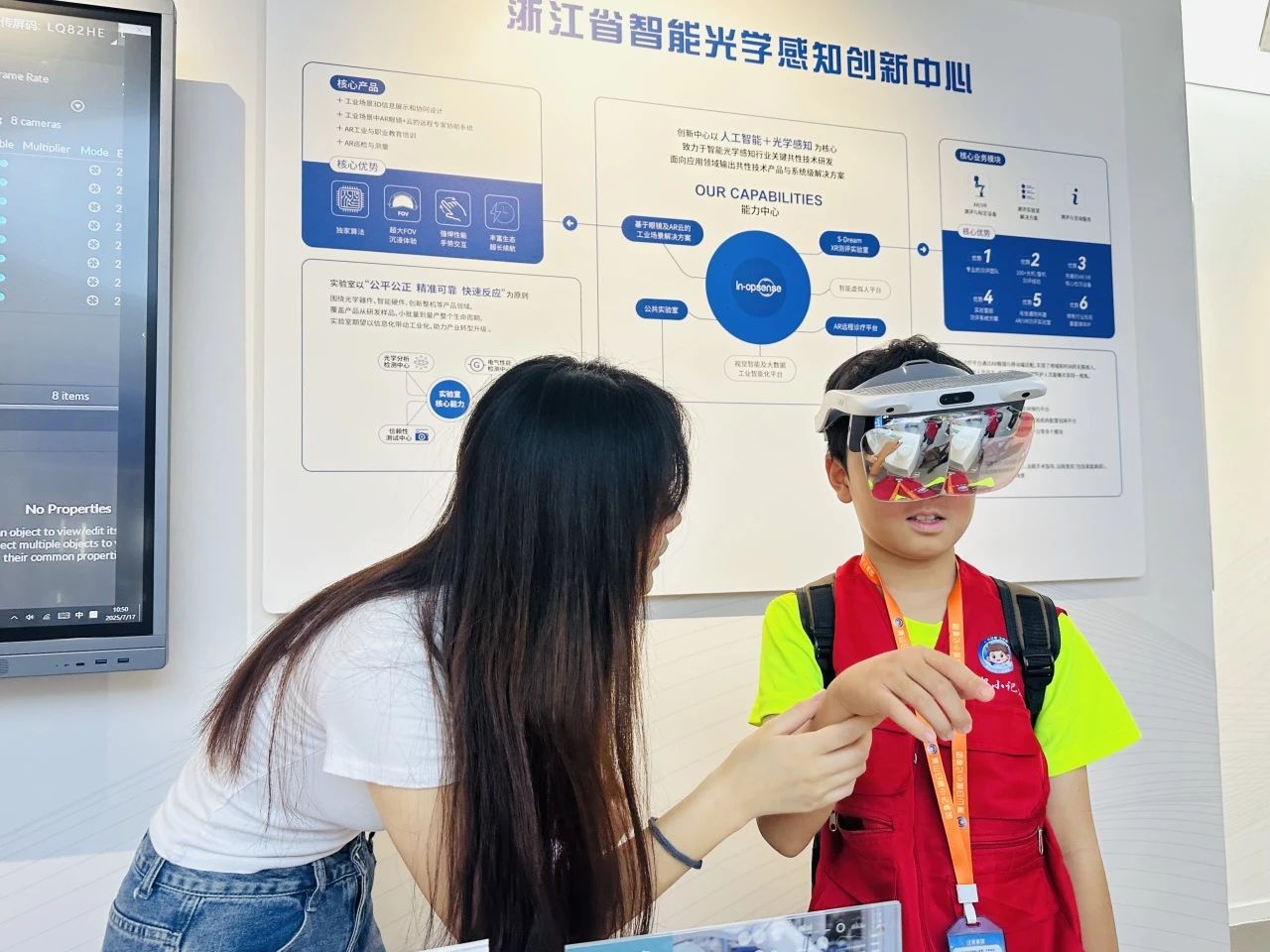 在启真大模型展区,小记者们与ai展开自然对话。"它能理解我的问题!"一位小记者兴奋地喊道。讲解员解释道,这类大模型技术正在医疗诊断、个性化教育等领域发挥着革命性作用。ar眼镜体验区传来阵阵惊叹,将活动推向高潮。小记者们通过虚实融合技术,"穿越"到数字工厂,身临其境地感受工业智能化的未来图景。在3d云阵相机前,大家争相体验"数字分身"技术,这项创新正在为数字经济发展注入新动能。"这里就像未来科技的孵化器。"一位小记者在参观笔记中写道。