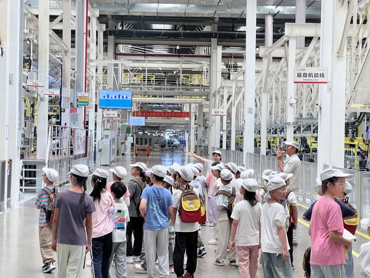 在拆解车展厅,发动机、底盘、电气系统等精密部件以"解剖"形态呈现,现代工业的复杂构造令小记者们惊叹不已。"原来汽车内部这么精密!"一位小记者一边记录一边发出感叹。在讲解员的带领下,他们系统了解了汽车工业的演进历程。而更触动小记者们心弦的一幕,来自广汽传祺的生产车间——211台abb点焊机器人组成的“钢铁军团”以精准的节奏舞动:焊装车间里,机械臂挥舞着焊枪火花四溅,70%的自动化率让车身组装行云流水;总装车间采用行业首创的l型布局,底盘合车系统通过281个点位同步紧固,最快仅需60秒就能完成一辆汽车的总装。"这些机器人就像未来战士!"小记者们的惊叹声此起彼伏。透过安全通道的玻璃,他们目睹了冲压件如何在机械臂的精准操控下"魔术般"变身为整车,直观感受到了"智能化改造、数字化转型"给传统制造业带来的改变。