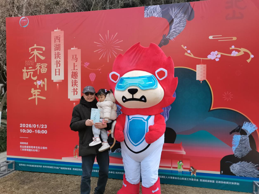 北山街道的百年古建筑群里,西小狮变身“书香反邪小卫士”。在“宋福杭州年·西湖读书日”的现场,市民们围在西小狮身边打卡拍照。