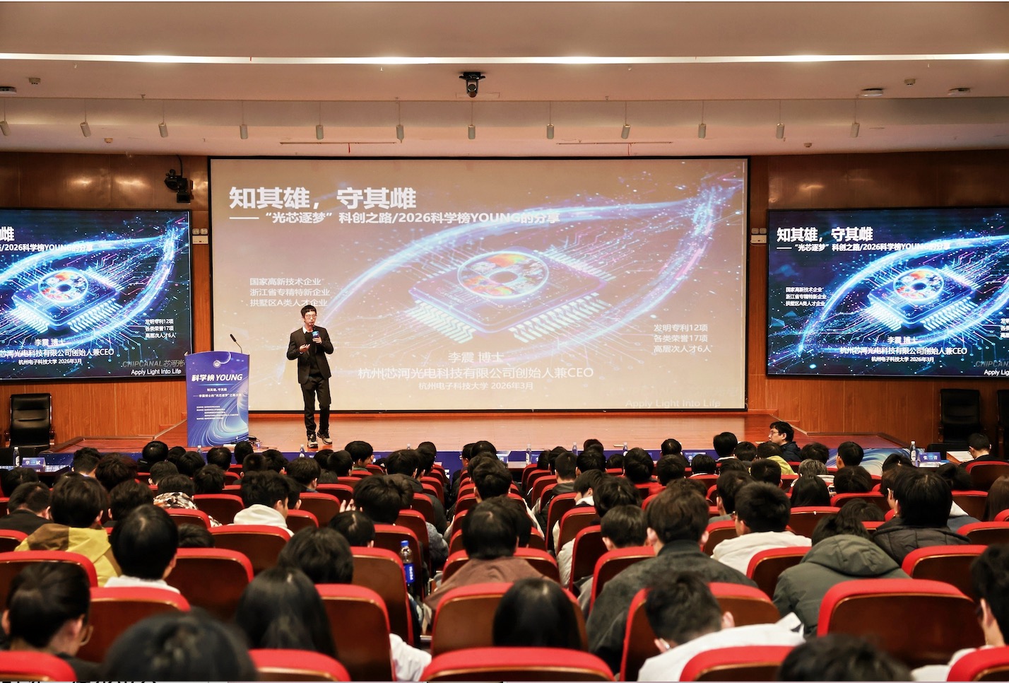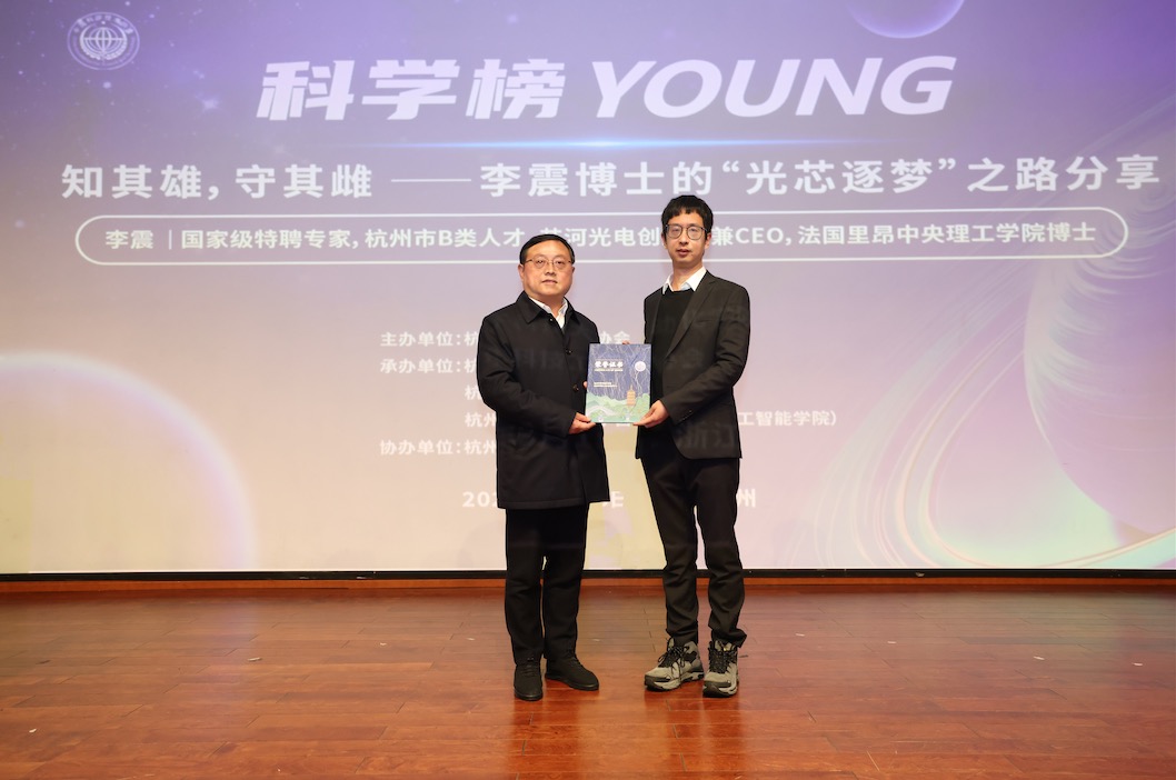 2026年3月18日下午,“科学榜young”第十五期活动在杭州电子科技大学自动化学院(人工智能学院)顺利举办。本期活动特邀国家级特聘专家、杭州市b类人才、芯河光电创始人兼ceo李震博士担任主讲嘉宾,以“知其雄,守其雌”——李震博士的“光芯逐梦”之路分享为核心主题,与相关专业科技工作者代表及杭电师生近300人齐聚一堂,线上听众1000余人,共探光电子芯片领域的科研创新与产业发展。